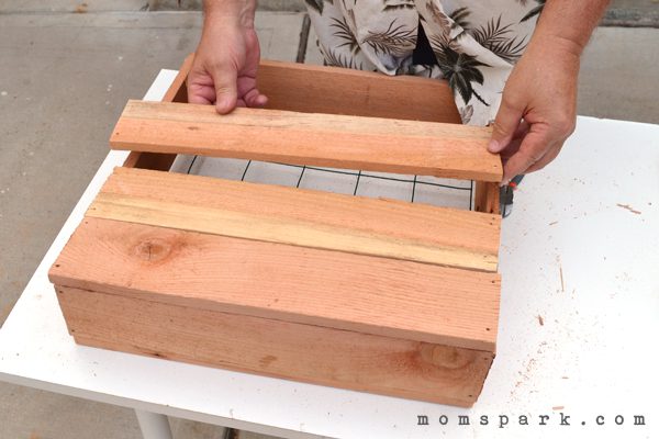 Use your staple gun to attach your wire mesh to the inside of your planter. This mesh is left over from a fence, but the chicken wire is just as easy to use and a lot cheaper if you’re buying everything to start from scratch.