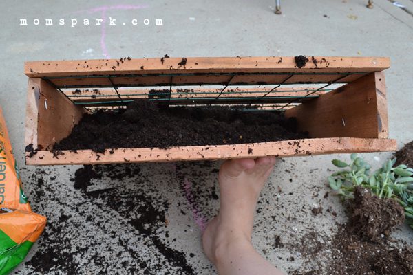 Take your soil and, with your pallet at an angle, fill ‘er up. I used my foot to keep it at the proper angle, and it was pretty easy.