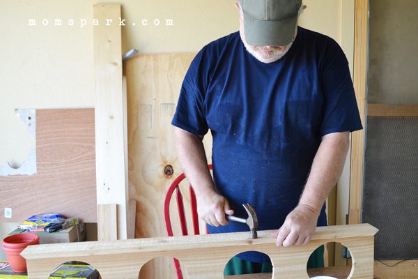 Nail one of your 41 3/4″ boards onto the side of your top (with the circles). Make the board flush with the top side before nailing in.