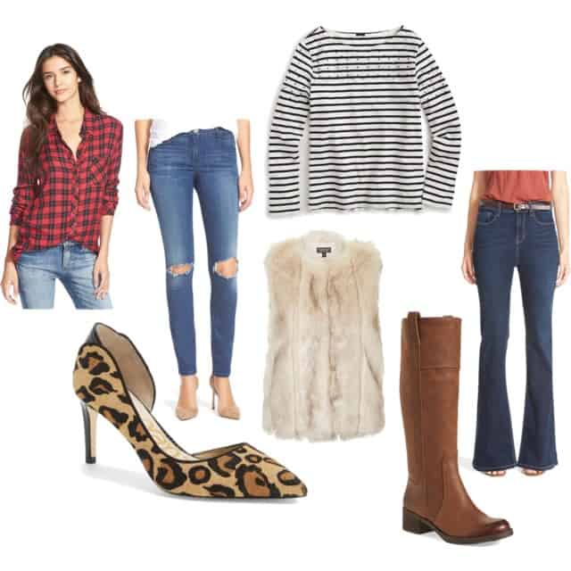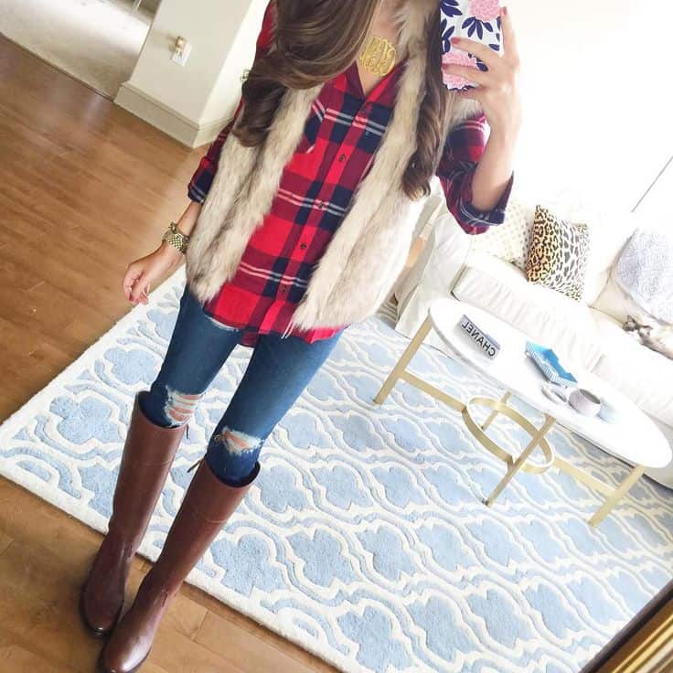 Hunter Plaid Shirt | Busted Knee Skinny Jeans | Embellished-Yoke Striped T-Shirt | Top Shop Leah Faux Fur Vest | High Rise Flare Leg Jeans | Sam Edelman Half d’Orsay Pointy Toe Pump | Heloisse Boot