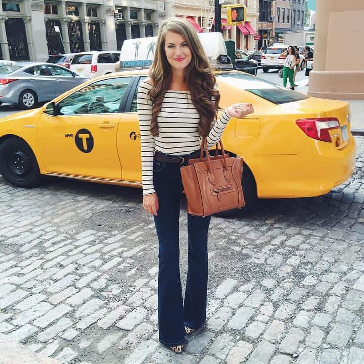 Classic nautical stripes, wide leg denim, plaid, fur vest — I think @cmcoving is rocking fall style like nobody’s business! I love the casual plaid matched with a trend fur (or perhaps faux fur) vest over skinny jeans — this screams autumn and coziness! I’m also loving the 70s throwback style happening in her first outfit — with a tiny peek of leopard print from her shoes. So cute!