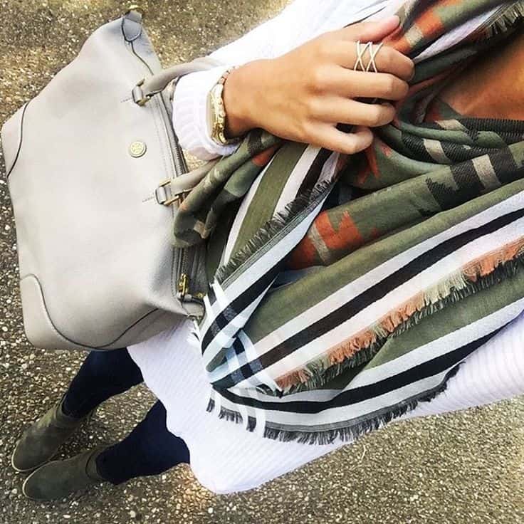 These two cute snapshots are from @a_southerndrawl and I’m obsessing over her scarves, of course! Oversize scarves are a total must for fall — it’s not just about looking great, it’s about staying warm, folks! A huge scarf, expertly folded, provides one heck of a lot of warmth! I’m also loving her rings and those gorgeous green booties. Beautiful!