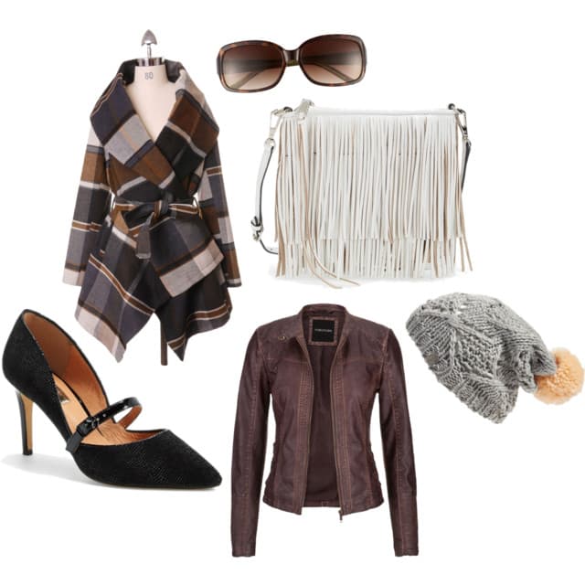 Prairie Check Rabato Coat | Lime Tortoise Sunglasses | Rebecca Minkoff Finn Convertible Leather Clutch | Marci Mary Jane Pump | Distressed Moto Jacket | Volcom Gypsy Queen Beanie