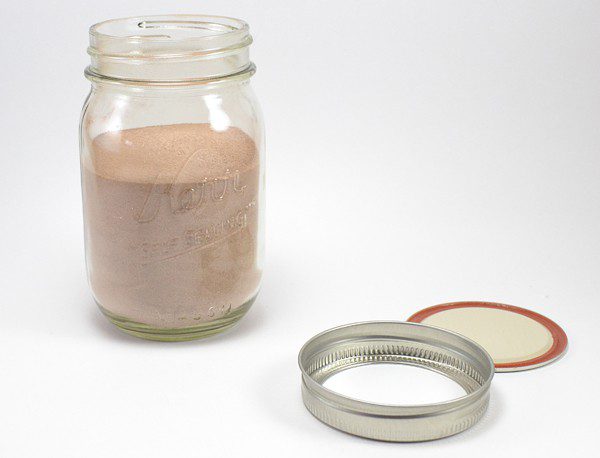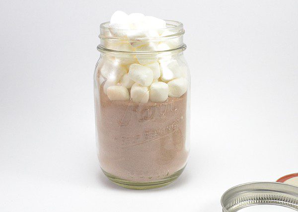 Fill your jar half to two-thirds full of cocoa mix. Side note… you can get a great deal on cocoa powder at warehouse clubs or you can search online for a recipe to make from scratch!
