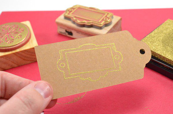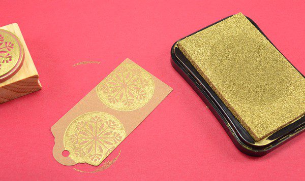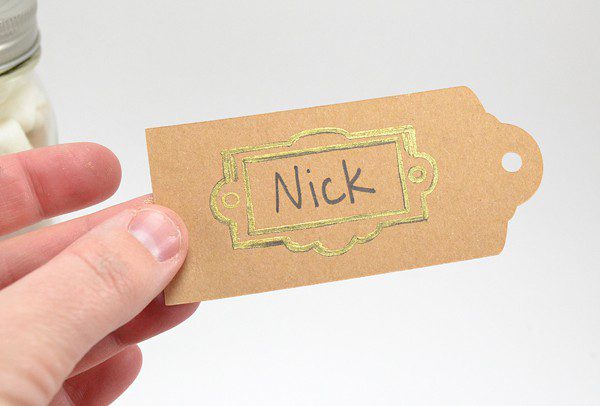Now it’s time to decorate your tags! I busted out a gold ink pad and some pretty snowflake rubber stamps. You can also hand draw or print a pattern onto the backside of your card. Be sure to leave enough room for directions on how to properly mix the cocoa with water or have a pattern you don’t mind writing on top of.