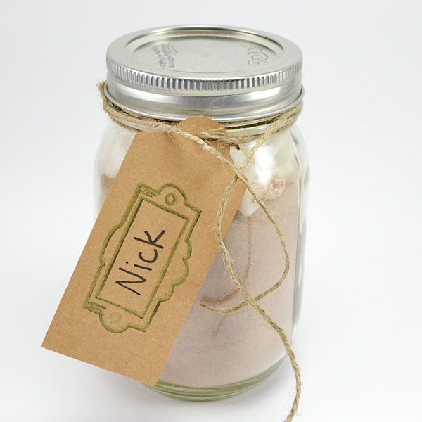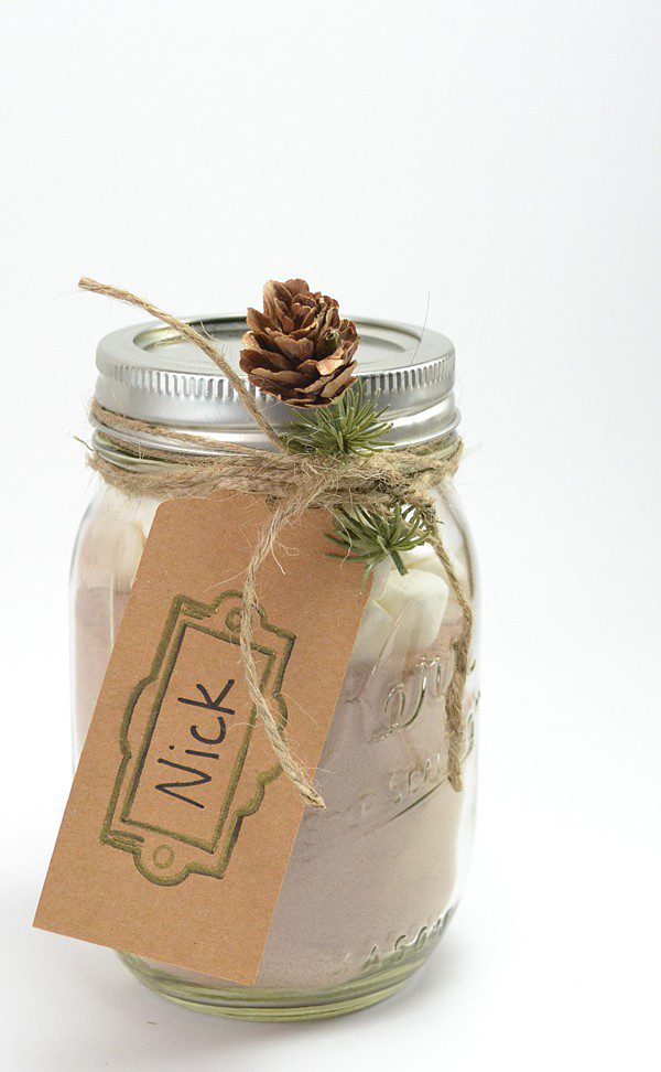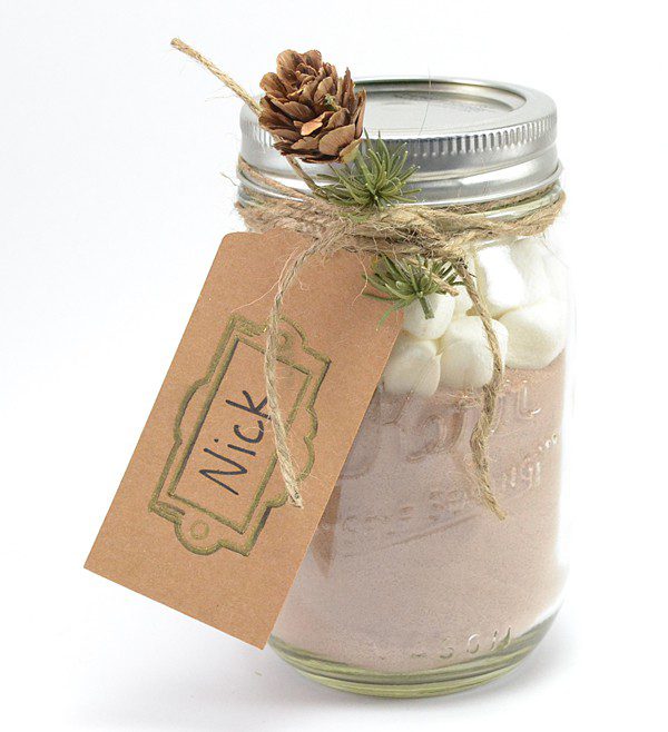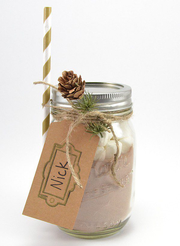A mason jar with a whole heck of a lot of hot cocoa mix and knocked out these pretty, simple, and sure-to-be well-received hot cocoa gifts!