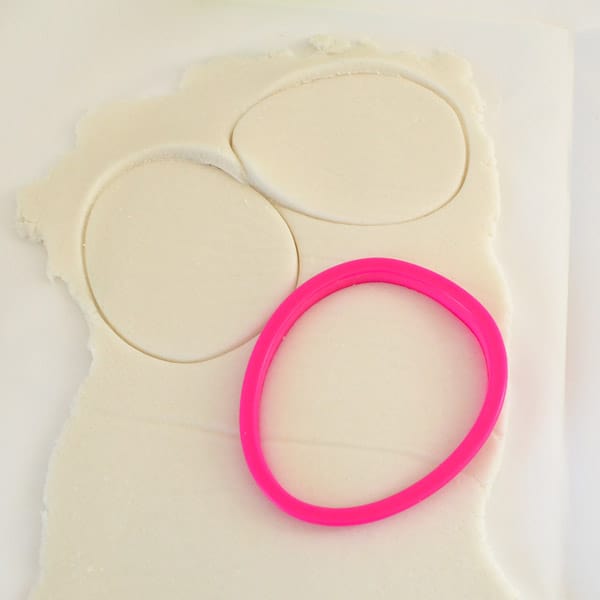 Use your cookie cutter to take out as many eggs as you can from your rolled-out piece. You will, of course, need to pull back the parchment paper in order to use the cookie cutter.
