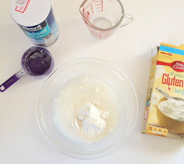 Here are your basic ratio… 1 part salt and 1 part water to 2 parts flour. So I made a pretty small batch with 1/2 cup of water 1/2 cup of salt and 1 cup of gluten-free rice flour blend.